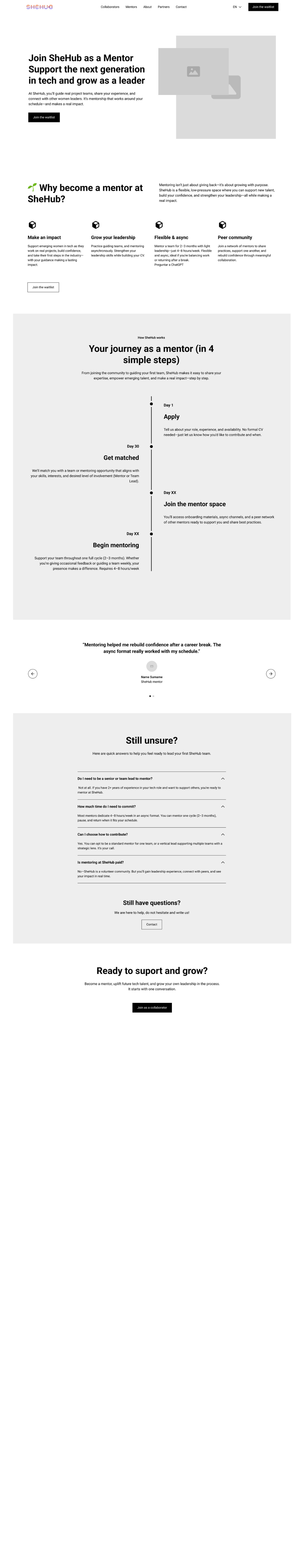 Although partnerships were still in an early stage at this point, we considered this page fundamental to the project. As SheHub is a non profit initiative, collaboration with partners plays a key role in sustainability and growth. Including this section in the wireframes allowed us to anticipate the visibility and importance of external support.